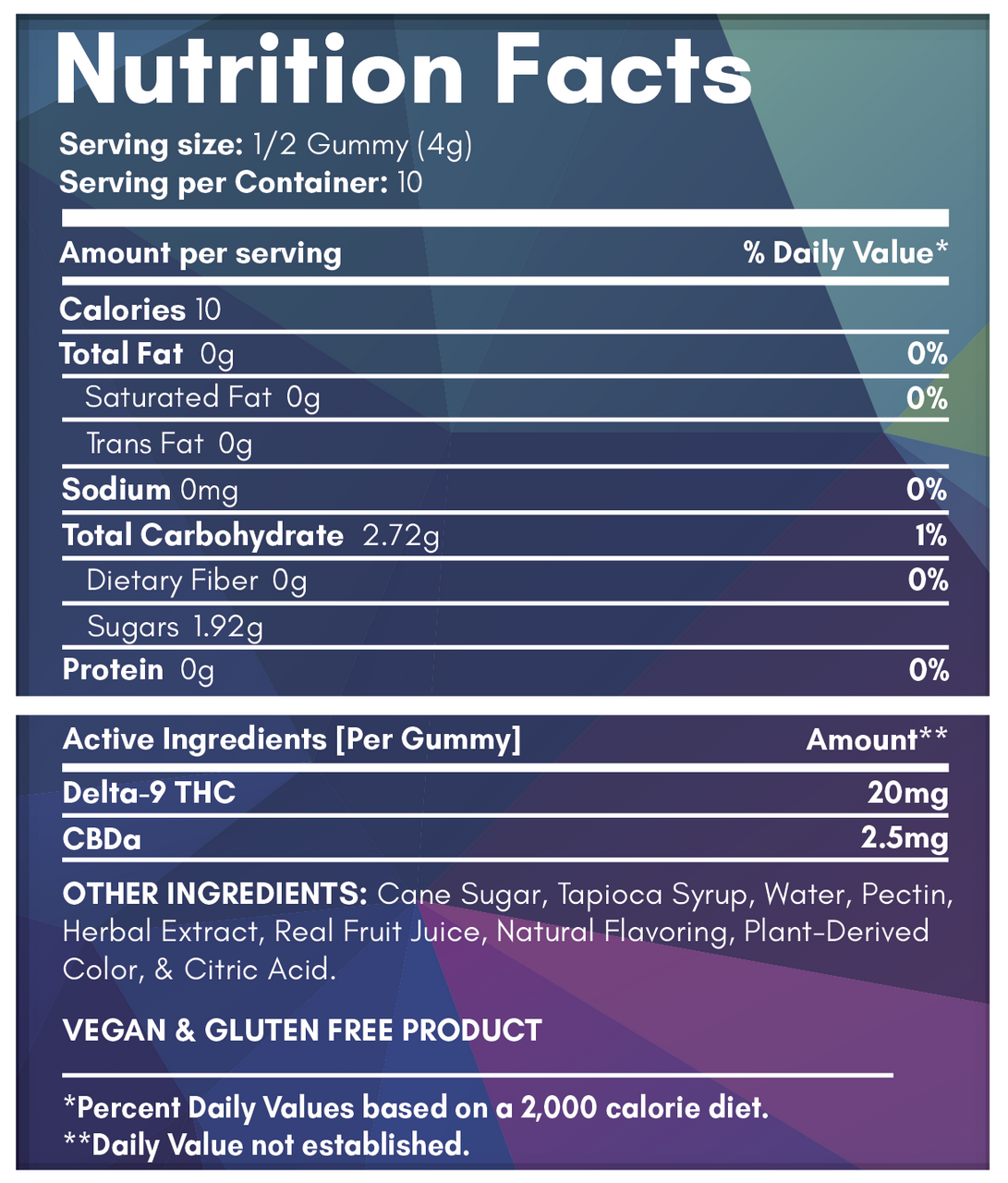 Many consumers describe the effects of Delta 9 THC as increasing presence, bringing down anxiety, and creating deeper and more meaningful social interactions and boosting mood. All of this can vary from person to person; as your state prior to consumption, the setting where these are consumed and your tolerance level will all create an experience nuanced to you. Whether you want to use Delta 9 THC to relax, feel more connected, enjoy nature, meditate, increase flow or party; this product is a great option and should benefit those experiences. Ingredients: Cane Sugar, Tapioca Syrup, Water, Pectin, Herbal Extract, Real Fruit Juice, Natural Flavoring, Plant-Derived Color, & Citric Acid. Suggested Serving: Start with a 1/2 gummy to gauge dose sensitivity. wait 1-2 hours before increasing dose, if necessary. Enjoy! It’s important to note that edibles take 30-60 minutes to first take effect (depending on a person’s digestive speed and other factors) and up to 1-2 hours to feel the peak of the effects. Never increase dosing until after 1-2 hours to ensure an accurate gauge of the peak intensity of the last dose and don’t cross-consume (consume with other products) the first time taking these so you know what the gummy’s effects are on their own. Store in a cool, dry place.