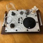 We include two swab jars, one for clean and one for dirty swabs and our ISO pump dispenser. The sommelier glass sippers are held on the tray with stainless posts so the are super secure and cannot fall over.
